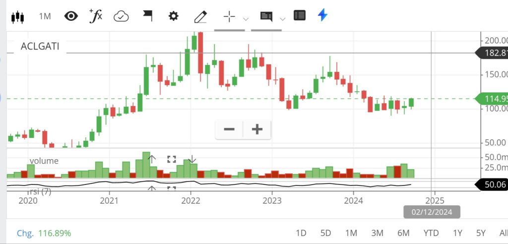 Monthly Chart of the ACLGATI stockNote: We are not SEBI registered advisors, read our disclaimer before making an entry based on this article.