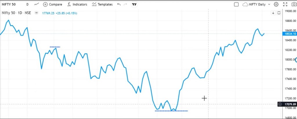 While trading, if you see that the price is observing resistance at a previous high instead of breaking it, wait for a decline up to the latest low. Once the price breaks below that low and you see that the ‘M’ has been formed, enter a trade with a stop loss above both the tops and the target can be kept, perhaps, at double the stop loss points. Also, remember to change your target level based on the price movement. If the price is seen observing support, exit early. On the contrary, if free fall is visible, hold the position for better returns.